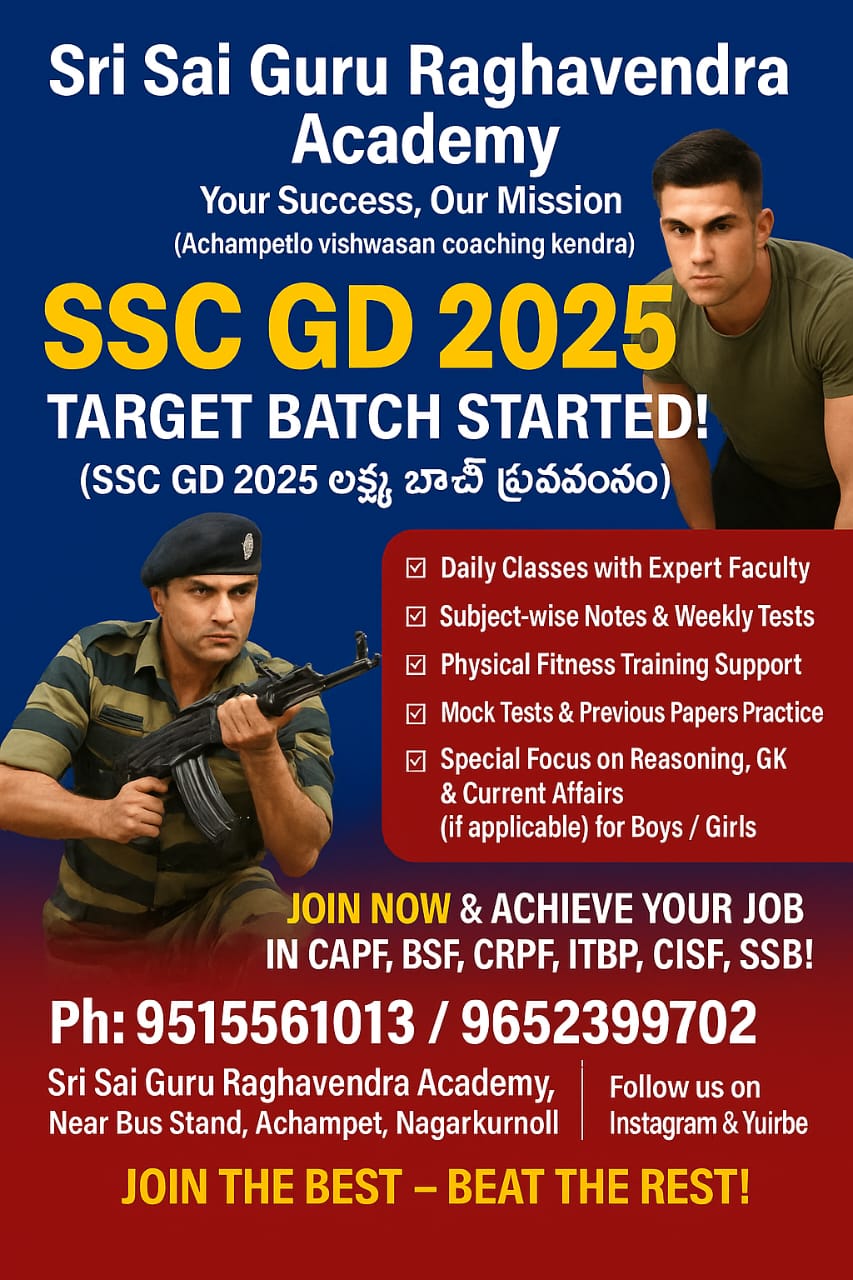 Sri Saii Gururghavendra Coaching Center Achampet located at KT Veeranna complex, near new Bus Stand Main Road Achampet nagarkurnool District Here The faculty Provide Excellent Coaching for stucents